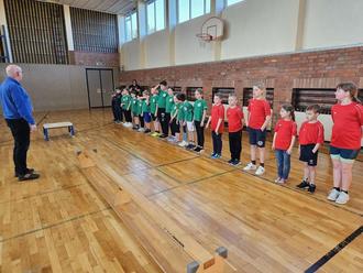Amtsjugendfeuerwehrwart Steffen Hoffmann begrüßte die Mädchen und Jungen und übernahm auch die Erwärmung. Danach wurden die Kinder in vier gemischte Staffeln eingeteilt. Die Betreuer der Kinderfeuerwehren bauten abwechselnd ihre vorbereiteten Parcours‘ auf und die Kinder durchliefen diese. Laufen, Hüpfen, Kriechen, Prellen, Balancieren und vieles mehr, wurde vom sechs- bis achtjährigen Feuerwehrnachwuchs erwartet.