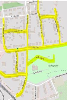 | WO: | Goethestraße | Parkstraße | Friedrich-Ludwig-Jahn-Straße | Kießerdamm | Fritz-Reuter-Straße | Heinrich-Heine-Straße | Dr.-Albert-Schweitzer-Straße | Theodor-Körner-Straße | Ternosenweg | Am Volkspark |