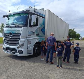 für den Notfall. Ein weiteres Highlight folgte am 16. Juli, beim Dienst zum Thema "Lkws im Straßenverkehr". Die Kinder durften einen echten Lkw der Firma Rumstich aus nächster Nähe erkunden und erfuhren, wie groß der tote Winkel tatsächlich ist. Anschaulich wurde erklärt, warum man nie zu nah an große Fahrzeuge herantreten