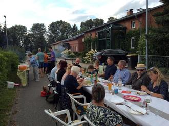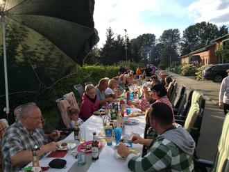Selbst eingelegtes Grillfleisch und Bratwurst finden schnell ihre Abnehmer und das Buffet wird eröffnet. Damit auch alles gut rutscht, gibt es hier und da schon ein kleines Schnäpschen mit den Nachbarn, oder die Flasche wandert die komplette Tafel einmal entlang. Gemütlich und mit vielen lustigen Gesprächen über alte Zeiten und was es neues im Dorf gibt, nimmt der Abend seinen Lauf. Es wird gelacht und jeder freut sich, dass die neuen Bewohner des Neuen Weg, sich gut bei uns eingelebt haben.