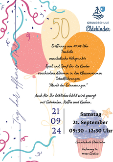 Seit nunmehr 50 Jahren gibt es an unserer Schule Abschiede und Willkommen. Das möchten wir zum Anlass nehmen und alle ehemaligen Schüler, Lehrer, Angestellte und Interessierte zu einem Tag der offenen Tür am Samstag, den 21. September 2024 von 9.30 bis 12.30 Uhr in unsere Grundschule einladen.