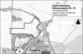 Der Hauptausschuss der Stadt Schönberg hat in seiner Sitzung am 27.04.2021 den Beschluss zur Aufstellung der Satzung über den Bebauungsplan Nr. 23 „Wohngebiet zwischen Dassower Straße und Feldstraße“ gefasst.