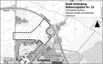 Die Stadtvertretung der Stadt Schönberg hat in ihrer Sitzung am 17.12.2024 den Vorentwurf des Bebauungsplanes Nr. 23 „Wohngebiet zwischen Dassower Straße und Feldstraße“ gebilligt und für die frühzeitige Beteiligung der Öffentlichkeit gemäß § 3 Abs. 1 BauGB und für die frühzeitige Beteiligung der Abstimmung mit den berührten Behörden und sonstigen Trägern öffentlicher Belange gemäß § 4 Abs. 1 BauGB bestimmt.
