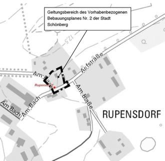 Die Stadt Schönberg hat den Entwurf des vorhabenbezogenen Bebauungsplanes Nr. 2 „Wohnbebauung Rupensdorf“ sowie den dazugehörigen Entwurf der Begründung (inkl. Umweltbelange) zur Öffentlichkeits- und Behördenbeteiligung bestimmt. Das Plangebiet befindet sich zentral in der Ortslage Rupensdorf. Die genaue Lage kann der Übersichtskarte entnommen werden.