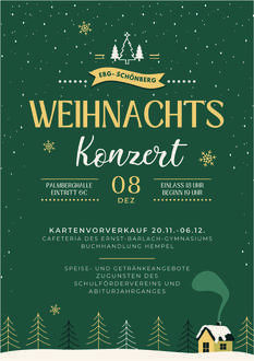 Voller Spannung und Vorfreude sehen die SchülerInnen des EBG Schönberg und weitere ProtagonistInnen unserem diesjährigen Weihnachtskonzert entgegen! Letztmalig im Jahr 2019 durchgeführt und nun wieder im großen Rahmen in der Palmberghalle, dürfen sich die Besucher auf Highlights freuen. Neben freudvollen Gesängen, anspruchsvoller Klaviermusik und Gedichtrezitationen wird auch der beliebte Elternchor wieder auftreten. Akrobaten, Theaterstücke der Oberstufenkurse und die seit dem Frühlingskonzert bestehende Lehrerband, welche zum Mitsingen animiert, werden die Herzen des Publikums höher schlagen lassen. Musikalische Ensembles und der traditionelle gemeinsame Gesang mit dem Publikum wird für alle Anwesenden die Weihnachtszeit einläuten. Wir freuen uns auf Ihren Besuch!