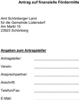 | 3.5 | Anträge auf finanzielle Zuwendungen sind bis zum 31.12. des laufenden Jahres (für das Folgejahr) beim Amt Schönberger Land, Am Markt 15 in 23923 Schönberg einzureichen. Die Gemeindevertretung entscheidet bis spätestens 31.03. des laufenden Jahres über die Vergabe der Fördermittel (vorbehaltlich der zur Verfügung stehenden Haushaltsmittel) für das kommende Haushaltsjahr. |