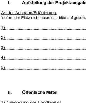 | 3.3 | Die zur Förderung beantragten Projekte sind zu benennen und kurz zu erläutern. Dabei sind Ort, Termin sowie die Zielgruppe zu nennen und dem Antrag beizufügen. |