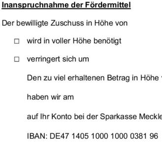 | 4.2 | Der Verwendungsnachweis besteht aus der Aufstellung der Kosten, welche in Form von Kopien der Rechnungen und Quittungen belegt wird. Des Weiteren ist ein Sachbericht der geförderten Maßnahme mit beizufügen. |