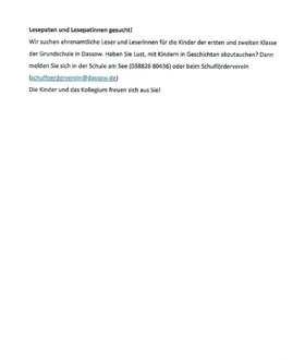 Wir suchen ehrenamtliche Leser und Leserinnen für die Kinder der ersten und zweiten Klasse der Grundschule in Dassow. Haben Sie Lust, mit Kindern in Geschichten abzutauchen? Dann melden Sie sich in der Schule am See (038826 80436) oder beim Schulförderverein (schulfoerderverein@dassow.de)