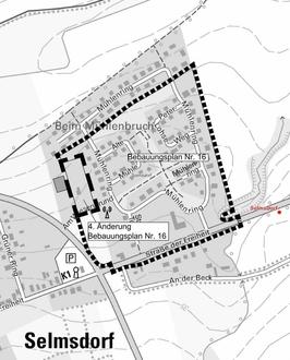 Der Geltungsbereich der 4. Änderung des Bebauungsplanes Nr. 16 umfasst die Flurstücke 77/8, 78/10 (teilw.) sowie 79/15 (teilw.), Flur 3, Gemarkung Selmsdorf Dorf. Das Planungsziel besteht in der Erweiterung des Allgemeinen Wohngebietes in nördliche Richtung. Es handelt sich dabei um eine Maßnahme der Nachverdichtung innerhalb des Wohngebietes am Mühlenbruch.