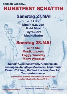 Das diesjährige Musikprogramm wird von dem Ortsansässigen Duo CYRCULART am Pfingstsamstag eröffnet. Thorsten Fixemer (Bass) und Anuschka Thomas (Gesang, Tanz und Percussion), präsentieren eigene Lieder, Chansons, vertonte Gedichte, Weltmusik und mehr. Am Abend bieten I-TAKI MAKI (ein italienisches Indie-Duo aus Berlin) mit ihrem tiefen emotionalen Sound ein musikalisches Hörerlebnis aus Rock, Slowcore, Post-Punk und minimalistisch arrangierten Kompositionen. Und auch die tanzbegeisterten Gäste kommen wieder auf Ihre Kosten und können ab 20.30 zu den Klängen der Klezmer-Band MUSKELKATER bis spät in die Nacht, das Tanzbein schwingen. Am Sonntag erfreut die Band FOGGY TUESDAY (aus Norddeutschland) die Gäste des Festes an wechselnden Orten des Dorfes mit irischen, schottischen und bretonischen Musikstücken. Und das MANY WAPPLER Swing Quartett beschließt am Pfingstsonntag mit seinem lebendigem 30er Jahre Repertoire das musikalische Programm des diesjährigen Kunstfestes in Schattin.