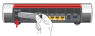 | 1. | In diesem Fall stecken Sie das SFP-Modul in den Steckplatz der FRITZ!Box mit der Aufschrift „Fiber SFP“. Falls Sie kein SFP-Modul mitgeliefert bekommen haben, fahren Sie mit Schritt 2 fort. |