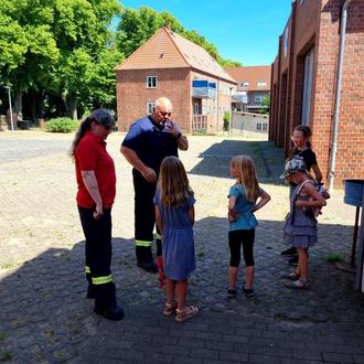 Kurzerhand traf ich mich mit Fred Krause und wir diskutierten und planten, einen gemeinsamen Nachmittag zu gestalten. Leider waren an dem Tag einige Kinder krank und bei 30°C war es wohl auch vielen Kindern einfach zu warm. Trotz allem trafen wir uns mit Fred und Sabine an der Feuerwehr. Erst einmal wurden viele Fragen gestellt und von den beiden beantwortet.