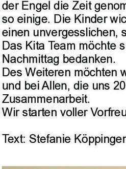 mitgeholfen und dabei durfte weder die Weihnachtsmusik, noch der Spaß fehlen. Am Nachmittag war es dann endlich soweit. Alle Gäste wurden vom Kita Team herzlich empfangen und zum Auftakt haben die Kinder ein kleines Programm präsentiert. Ein Dank geht an die Eltern die uns großartig mit einem kunterbunten Kuchenbuffet unterstützt haben. Dann war es soweit, ein Engel trat zur Tür hinein und die Kinderaugen leuchteten völlig fasziniert. Jedes Kind hatte nun die Möglichkeit sich ein kleines Präsent abzuholen und der Engel entlockte den großen Kindern sogar ein kurzes Gedicht. Danach hat sich der Engel die Zeit genommen um Fragen zu beantworten ... und davon hatten die Kinder so einige. Die Kinder wichen dem Engel nicht mehr von der Seite und somit sorgte er für einen unvergesslichen, sowie zauberhaften Moment.