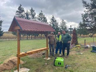 Ein besonderes Highlight des Aktionstages war jedoch das Aufstellen des neuen Gießkannen- und Hackenunterstands auf dem Friedhof. Das solide Holzgestell fügt sich harmonisch in die Umgebung ein und bietet künftig einen geschützten Platz für die Gartengeräte, die zur Grabpflege genutzt werden. Mit viel Liebe zum Detail entstand ein kleiner, aber äußerst praktischer Unterstand – wetterfest, ordentlich und schön anzusehen.