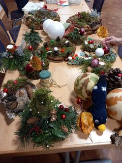 An vier Novembernachmittagen hatten die Einwohner der Gemeinde Alt Zachun und der umliegenden Orte die Möglichkeit, sich ihre Weihnachtsdekoration selbst herzustellen. Unter Anleitung eines erfahrenen Teams wurden Gestecke, Kränze und Sträuße gebunden. Die verschiedesten Naturmaterialien kamen zum Einsatz. Für genügend frisches Grün sorgte Familie Niemann aus Alt Zachun. Dafür sagen wir vielmals danke. Moos, Äste oder Zapfen wurden vom Bastelteam vorab in reichlicher Menge gesammelt bzw. reichlich Holzscheiben geschnitten. Mit Kugeln, Schleifen oder genügend Glitzer entstanden wahrhaft schöne Gebilde.