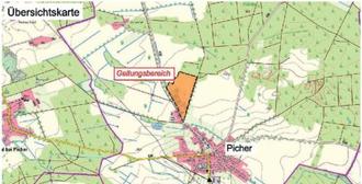 Der räumliche Geltungsbereich des Bebauungsplans ist der als Anlage beigefügten Übersichtskarte zu entnehmen. Er beläuft sich auf eine Größe von etwa 18,0 ha und umfasst die Flurstücke 35/5, 35/6, 35/7, 35/8 (tlw.), 37/1, 39/3, 39/4, 39/5, 39/6, 82/20, 94/1 und 94/2 der Flur 2 in der Gemarkung Picher.