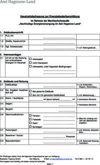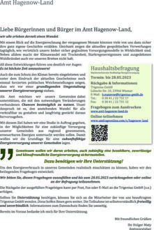 Verbleib und Aufbewahrung der Daten: Die erhobenen Daten werden vertraulich und ausschließlich zum genannten Zweck verwendet. Die Befragung erfolgt durch das Amt Hagenow-Land. Mit der Auswertung der gesammelten Daten ist durch das Amt Hagenow-Land die Trigenius GmbH, Lübsche Str. 10, 23966 Wismar, betraut. Der Datenschutz wird in allen Arbeitsschritten durch geeignete technische und organisatorische Maßnahmen sichergestellt. Die Daten werden nur so lange aufbewahrt, wie dies zur Erstellung der Machbarkeitsstudie sowie zur ggf. erforderlichen Nachweisführung gegenüber Dritten (z.B. Fördermittelgeber) erforderlich ist. Anschließend werden sie vollständig gelöscht / vernichtet. Dieser Zeitraum beträgt maximal 10 Jahre.
