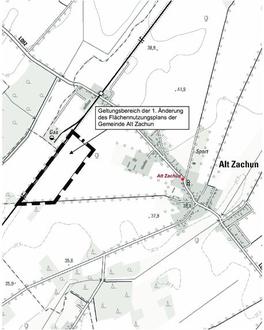 Die Gemeindevertretung der Gemeinde Alt Zachun hat am 18.03.2024 die Aufstellung der 1. Änderung des Flächennutzungsplans beschlossen. Das Ziel der Planung liegt in der Darstellung einer Sonderbaufläche nach § 1 Abs. 1 Nr. 4 BauNVO mit der Zweckbestimmung „Photovoltaik“. Dadurch wird das Aufstellen eines Bebauungsplans (vorhabenbezogener Bebauungsplan Nr. 1) für die Errichtung einer Freiflächen-PV-Anlage planungsrechtlich vorbereitet.