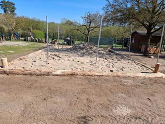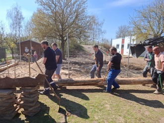 Bereits ab 8 Uhr morgens wurde geschaufelt, gehämmert und transportiert. Dank der kräftigen Mithilfe der Eltern konnte die alte Sandkiste komplett abgetragen und ein neuer, großzügiger Sandspielbereich angelegt werden. Die Umrandung aus massiven Baumstämmen stammt vom Forsthof Radelübbe – eine natürliche und zugleich stabile Lösung, die dem Spielbereich einen rustikalen Charme verleiht.