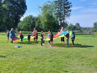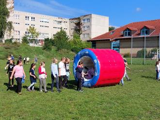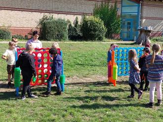 z. B. 4 gewinnt, Dosenwerfen, Leitergolf und Tauziehen. Mit ihrem Paten an der Seite waren die Erstklässler mutig und trauten sich auf den Balanciersteig, auf Stelzen zu laufen oder in das riesige aufgepumpte Laufrad LOOPI. Wer es etwas ruhiger brauchte, konnte auf dem Pflaster des Schulhofes schöne Bilder oder erste Buchstaben malen und schreiben.