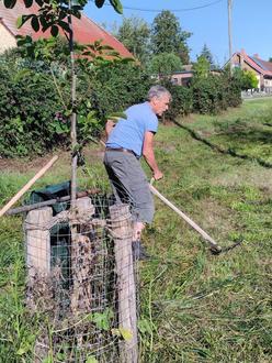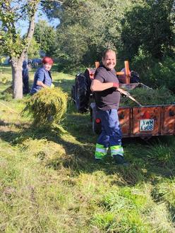 Mitte September nahmen die BienenfreundInnen die Mahd der gemeindeeigenen Streuobstwiese in Neuhof auf, die vorab durch das Mähen mit dem neuen, alten Balkenmäher entstand. „Die Gemeinde hat dieses Jahr auf der Streuobstwiese in Neuhof einen Brunnen installieren lassen“, informiert Harald Lehmann, Mitstreiter der Initiative, und ergänzt: „dadurch konnten wir unsere zwei gespendeten 1000-Liter Wassercontainer verkaufen-, und uns von dem Erlös einen eigenen, gebrauchten Balkenmäher anschaffen“.