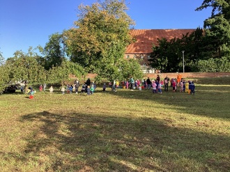 Am Dienstag, den 23.09.2025, machten sich rund 140 Kinder im Alter von 1 bis 10 Jahren auf den Weg zur Streuobstwiese in Neukloster. Die Kindergarten- und Hortkinder der Kita Sonnenkamp sammelten eifrig die zuvor vom Bauhof geschüttelten Äpfel auf.