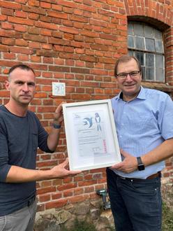 1. Gemeindebürgermeister Ronny Krüger überreicht die NABU-Urkunde an Dirk Hacker: Hof Hacker in Lübberstorf ist nun offiziell ein ‚Schwalbenfreundliches Haus‘.