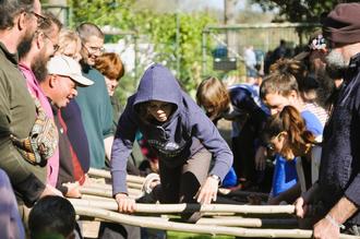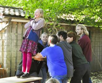 Wie immer in Zurow, durften sie natürlich auch gleich mit anpacken: Für Mutproben wurden alle Hände gebraucht – zum Beispiel beim Sich-rückwärts-fallenlassen in die Arme der Anderen. Oder beim blinden Balancieren auf der Slackline.