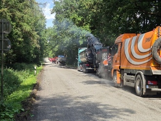 Die Arbeiten begannen täglich früh am Morgen. Zunächst wurden die Tagesabschnitte eingerichtet, Maschinen in Stellung gebracht und letzte Abstimmungen getroffen. Anschließend startete der eigentliche Fräsvorgang: Der bestehende Asphaltbelag wurde schichtweise abgetragen – gleichmäßig, präzise und unter ständiger Kontrolle der Frästiefe. Zeitgleich waren die Reinigungsfahrzeuge unterwegs, um das abgetragene Material zu beseitigen und die Flächen für die nachfolgenden Baugewerke sauber zu hinterlassen. Für eine möglichst staubarme Ausführung wurde während der Fräsarbeiten kontinuierlich Wasser zugeführt. Die Tagesziele waren klar definiert, sodass die Arbeiten trotz der Größe der Gesamtfläche zügig vorankamen. Durch die vollständige Sperrung der L14 konnte die Ausführung konzentriert und ohne laufenden Verkehr erfolgen – ein wichtiger Sicherheitsfaktor für alle Beteiligten.