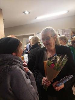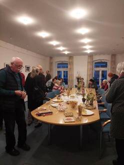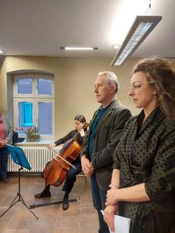 Bürgermeister Frank Meier und die Vorsitzende der GEDOK-MV-Gruppe Sophia Maeno begrüßten am 09.02.2023 zahlreiche Gäste zur Vernissage. Zur musikalischen Umrahmung spielte Kamila Sinitska auf dem Cello.