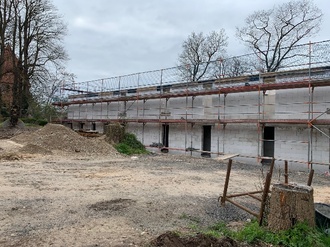 Bald wird sich die rote Ziegelfassade zeigen, denn die Verblendarbeiten beginnen Anfang Mai. Mit dem Einbau der Fenster kann Ende Mai begonnen werden. Die Baustelle wird sich im Mai enorm wandeln, etliche Gewerke nehmen ihre Arbeiten auf, sodass der Baufortschritt für jeden ersichtlich wird.