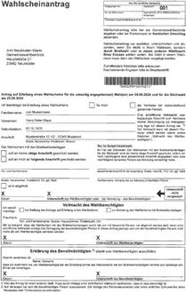 Auf der Rückseite der Wahlbenachrichtigung finden Sie den Wahlscheinantrag für die postalische Beantragung eines Wahlscheins mit Briefwahlunterlagen. Bitte für den Versand einen frankierten Umschlag verwenden.