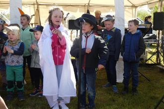 'Vogelhochzeitspaar' Leonie und Joris mit den Kindern der Kita 'Regenbogen'