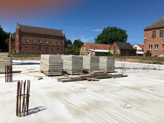 Die Gründungsarbeiten für den Erweiterungsneubau sind abgeschlossen, alle Grundleitungen verlegt und die Erdarbeiten mit Abtreppung zum Bestandsgebäude fertig. Es wurden ca. 400 m³ Beton und ca. 80 t Stahl verbaut. Am 09.06. (leider vor Erscheinen dieses Blattes) kann die Grundsteinlegung mit Schule, Stadtvertretern und Baufirmen gefeiert werden. Ab dem 12.06. wird die Rohbaufirma beginnen, die Wände des ersten Geschosses zu errichten. Die Schalplatten liegen schon auf der Baustelle.