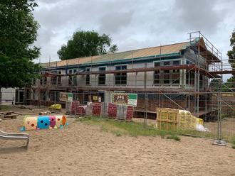 Wie zum Richtfest von den Kitakindern besungen, zeigen die fleißigen Handwerker ihr Können. So präsentiert sich die neue Kita im Bereich des Erdgeschosses im klassischen rot. Die Haustüren und die grauen Holzfenster sind längst eingebaut. Der Dachdecker hat seine Arbeiten aufgenommen und das Dach bereits gedämmt und abgedichtet. Somit ist das Gebäude geschlossen und die Ausbaugewerke können beginnen. Mittlerweile lässt sich erahnen wie das Gebäude fertiggestellt aussehen wird.