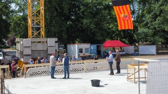 Auf der Baustelle geht es inzwischen flott weiter. Die Wände des Erdgeschosses sind teilweise betoniert und weitere Bereiche eingeschalt. Das Gerüst wurde im Erdgeschossbereich errichtet und wird Zug um Zug mit den Geschossen weiter hochgezogen.