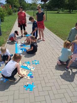 Durch die TeamerInnen des DLRG-Nivea- Kindergartentages wurden die Baderegeln auf spielerische Art und Weise vermittelt. Hierbei hatten die Kinder vor allem beim Puzzeln des Baderegel-Puzzles viel Spaß.