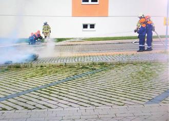 Nach dem Kaffee wurden Stühle und Bänke auf den Parkplatz an der Stadthalle aufgestellt und es gab eine Vorführung der Wariner Jugendfeuerwehr. Sie mussten ein Feuer per Löschangriff nass löschen. Das funktionierte reibungslos und es gab einen großen Applaus von den Zuschauern.