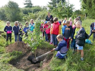 Die Bäume wurden direkt am 3.Schultag eingepflanzt und die Kinder können sich nun die nächsten 4 Schuljahre um sie kümmern.