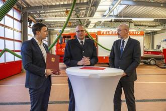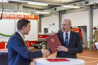 Matthias Radtke, Röbels Bürgermeister empfängt den Zuwendungsbescheid für das neue TLF3000 der Feuerwehr von Innenminister Christian Pegel