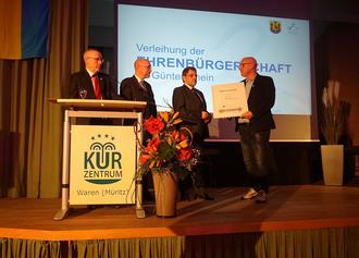 Waren (-lke). „Waren ist schön“. Dieses Motto des ehemaligen Bürgermeisters Günter Rhein spielte immer wieder eine Rolle im Verlauf des Jahresempfangs der Stadt Waren. Gottlob hatte das Sturmtief „Elli“ die Region um Waren verschont, so dass sich zahlreiche Gäste aus Politik, Kultur und Wirtschaft sowie Warener Bürger im Saal des Kurzentrums auf dem Nesselberg einfinden konnten. Auch Innenminister Christian Pegel hatte es sich neben vielen Persönlichkeiten aus Politik, Wirtschaft und Kultur nicht nehmen lassen, diesem Ereignis beizuwohnen. Im Mittelpunkt des Abends stand vor allem die Verleihung der Ehrenbürgerschaft an Günter Rhein. Mit dieser höchsten Auszeichnung würdigte die Stadt sein langjähriges, herausragendes und nachhaltiges Wirken für unsere schöne Stadt sowie sein besonderes Engagement zum Wohle der Bürgerinnen und Bürger. Einstimmig hatten die Stadtvertreter für diese besondere Ehrung votiert, was Bürgermeister Norbert Möller als Ritterschlag bezeichnete. „Meine Arbeit war nicht nur ein Job“, betonte Günter Rhein in seiner Dankesrede. Originell wurden die Grußworte verschiedener Weggefährten per Video übermittelt. Der ehemalige Stadtbaudirektor Günther Lüdde bezeichnete ihn als „Kümmerer und Netzwerker, der verbindet statt zu spalten.“ Und so spielten die Musiker des Warener Blasorchesters ihm zu Ehren Lieder seiner Lieblingsband, den Beatles. Ein kurzer Rückblick auf 2025 erfolgte durch Bürgermeister Norbert Möller. Neben vielen positiven Ereignissen stellte die Sperrung der Herrenseebrücke einen gravierenden Einschnitt in das Verkehrsgeschehen der Stadt dar. Auch 2026 wird herausfordernd. Ebenso bot der Abend den feierlichen Rahmen für die Verleihung des „Richard-Wossidlo-Kulturpreises“ an den Organisator des traditionellen jährlichen Musikantentreffens, Alexander Börst. Den Wirtschaftspreis gab es in zwei Kategorien. Den Preis für „Gesundheitswirtschaft, Digitalisierung und Innovation“ durfte die Klinik Amsee in Empfang nehmen. Der Preis für „Regionales Engagement, Nachhaltigkeit und soziales Unternehmertum“ wurde zwei Warenern verliehen, die allen das Leben „versüßen“, nämlich der Schokoladenmanufaktur Hover Chocolates GmbH „Kilian & Close“. Wohltuend bei allen kam an, dass sich der zeitliche Rahmen in einem verträglichen Rahmen hielt. Im Anschluss an die Veranstaltung bestand ausreichend Gelegenheit, miteinander ins Gespräch zu kommen und den Jahresempfang in angenehmer Atmosphäre ausklingen zu lassen.