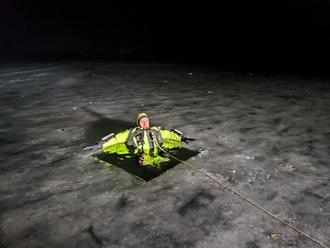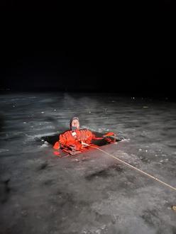Steffen Bleichroth, Rechliner Feuerwehr, „opferte“ sich im Überlebensanzug für die Eisrettungsübung am 14. Januar in Gotthun