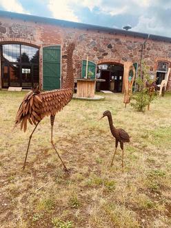 Vor ein paar Jahren schnitzte Schwörck der Finckener Kirche Kirchenfiguren und die Massower Kirche erhielt ein neues Gestell für den Taufstein in Form aus Holz geschaffenen Händen, die die Taufschale halten. „Ich muss nicht berühmt werden“, meint Gerald Schwörk bescheiden, angesichts der ca. 150 Besuchern an beiden Tagen, sind die Skulpturen und deren Erschaffer zumindest in der Region sehr bekannt, der eine oder andere Gast verliebte sich in die filigranen Gartenfiguren, andere blieben staunend vor dem aus Hufeisen geschmiedeten lebensgroßen Esel und seinem hölzernen Führer stehen. Eine Lieblingsfigur oder -plastik gibt es bei Gerald Schwörk nicht, jede Figur, die er anfängt, ist sein Favorit.