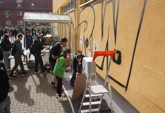 Waren (-lke). Buntes Gewimmel herrschte am 21. Mai bei schönstem Frühlingswetter um und in der Regionalen Schule Waren/West. An diesem Tag veranstaltete die Schule ihr mittlerweile drittes Straßenfest. Und jeder, der kommen wollte, war willkommen. Alle Schüler und Lehrer waren in die Vorbereitungen eingebunden und präsentierten sich zum Teil mit eigenen Angeboten. „Die Großen übernahmen zudem die Betreuung der jüngeren Schüler“, teilte uns Lehrerin Carmen Siegmund mit. Bei ihr und ihrem Kollegen Karsten Appel liefen alle Fäden zusammen. Ob gemeinsames Trommeln, Drehen am Glücksrad, Kinderschminken, Besuch der Hüpfburg oder Lichtschießen, für jeden Geschmack war etwas dabei. Externe Organisationen, Firmen und Vereine der Stadt hatten sich ebenfalls mit ihren Angeboten eingebracht. Ebenfalls boten die Schüler verschiedene kulinarische Köstlichkeiten an. Auch die an der Thomas-Mann-Straße liegende Kita, das DRK-Pflegeheim und das Hospiz beteiligten sich an dem bunten Treiben. „Das ist einfach Schule mal anders. Und wir wollen das zu einer Tradition entwickeln. Danke an alle, die sich hier so aktiv eingebracht haben!“ lautete das Resümee Karsten Appels. Einen der Höhepunkte bot der Sprayer Maurice Noßack, der gemeinsam mit interessierten Schülern ein großes Schullogo an die Wand neben dem Eingang anfertigte. „Das war ein tolles Fest“, bestätigte uns eine Anwohnerin, die es sich nicht hatte nehmen lassen, sich in das bunte Treiben zu „stürzen“.