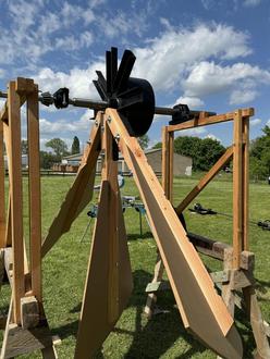 Das fand auch Andreas Hamann, der als Haustechniker beim KSR für die Mühle zuständig ist. Er kontaktierte im Frühjahr dieses Jahres den Ingenieur Enno Möller, der bei einem Malchower Maschinenbauunternehmen tätig ist und sich bereits 2021 die defekte Windrose angeschaut hatte. Gemeinsam gingen sie in dieser Angelegenheit auf die Stadt Malchow zu, die dann entschied, die Windrose mit dem Getriebe überarbeiten zu lassen, damit sich langfristig die Flügel wieder drehen können. Andreas Hamann konstruierte danach aus festem, hochwertigen Douglasienholz die neuen Arme und Flügel der Windrose. Das Malchower Maschinenbauunternehmen baute das neue Getriebe darin. Um den Abbau der alten und den Anbau der neuen Windrose kümmerte sich ein Malchower Dachdecker, der dabei auf einen Teil seiner Vergütung verzichtete. Die Freiwillige Feuerwehr Malchow und weitere Haustechniker sowie Mitarbeiter der Stadt halfen beim Ab- und Anbau ebenfalls mit. Im März hatte man die alte Windrose abgenommen - am Pfingstsamstag wurde die neue montiert.
