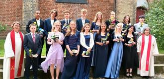 Die 15 Konfirmierten und Anja Lünert (l.i.B.) sowie Uta Lück