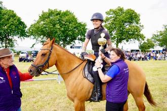 v.l.n.r.: Wilhelm Jarchow (Ehrenvorsitzender Ponysportverein), Lena Rieckhoff auf Limit (aus Fincken, Siegerin des Hauptrennens Speckreiten) und Katharina Kroeger (Vorsitzende Ponysportverein)
