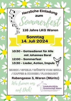Waren (pm). Ein buntes Programm mit Musik, Spielen, Grillwürsten, Flohmarkt sowie Kaffee und Kuchen erwartet die Besucher des Sommerfestes, das die Landeskirchliche Gemeinschaft Waren am Sonntag, 14. Juli anlässlich ihres 116. „Geburtstages“ in der Rabengasse 3 feiert. Um 10.30 Uhr beginnt das Fest mit einem Gottesdienst für Klein und Groß. Ab 12.00 Uhr wird zu einem leckeren Mittagessen eingeladen. Für Kinder werden verschiedene Spielstationen angeboten. Auch einen kleinen aber feinen Flohmarkt wird es geben. Gastreferent des Tages ist Johannes Baral aus Witzin. Zu diesem Programm für die ganze Familie sind alle herzlich willkommen.Weitere Informationen gibt es unter 03991 1870481 / Landeskirchliche Gemeinschaft Waren.