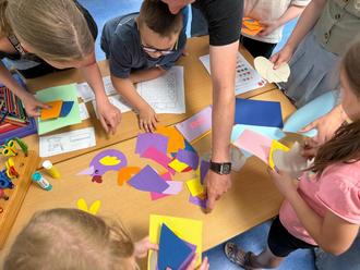 Röbel (stgü). Mittwoch, der 18. Juni 2025: Ein Tisch im Klassenraum der vierten Klasse in der Röbeler Grundschule wurde mit Scheren, buntem Papier und tollen Stiften bestückt. Fröhlich stürzten sich Kita-Kinder der Kita Müritz Entdecker und die Viertklässler auf die Arbeitsmaterialien. Es setzten sich jeweils zu zweit und manchmal zu dritt ein oder zwei Kita-Kinder und ein Grundschulkind an einen Tisch. Das Ziel dieser spaßigen Unterrichtsstunde war das Basteln eines schönen Freundschaftsvogels aus Buntpapier.